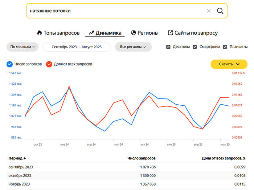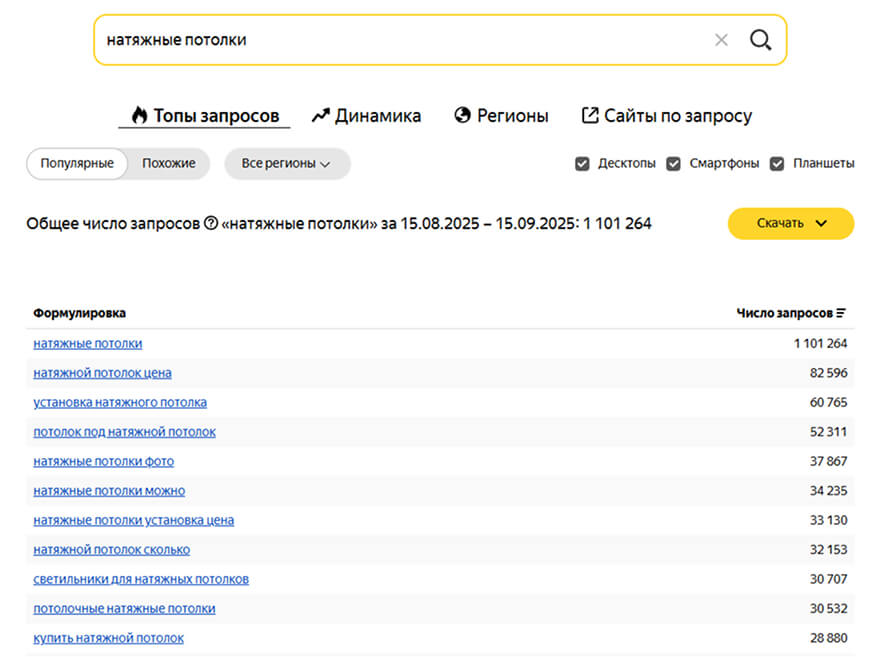 · собрать полное семантическое ядро и разработать структуру проекта, · проанализировать сезонность, частотность, спрос по конкретным регионам и определить долю ключей по устройствам (смартфон, десктоп, планшет), · использовать только те фразы, которые приведут к качественному трафику и целевым действиям от заинтересованных пользователей