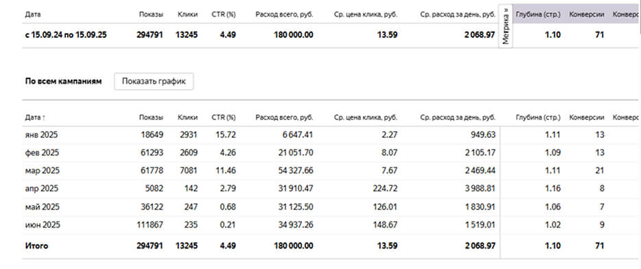 — Определили основные ключевые слова, по которым будем рекламировать компанию и привлекать трафик — Сделали сортировку по группам и для каждой ключевой позиции создали своё объявление — Установили Яндекс. Метрику и связали её с сайтом